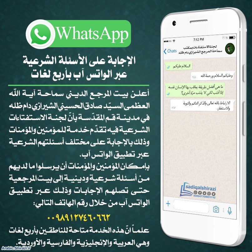 أعلن بيت المرجع الديني سماحة آية الله العظمى السيّد صادق الحسيني الشيرازي دام ظله في مدينة قم المقدّسة بأنّ لجنة الاستفتاءات الشرعية فيه تقدّم خدمة للمؤمنين والمؤمنات وذلك بالإجابة على مختلف أسئلتهم الشرعية عبر تطبيق الواتس آب.