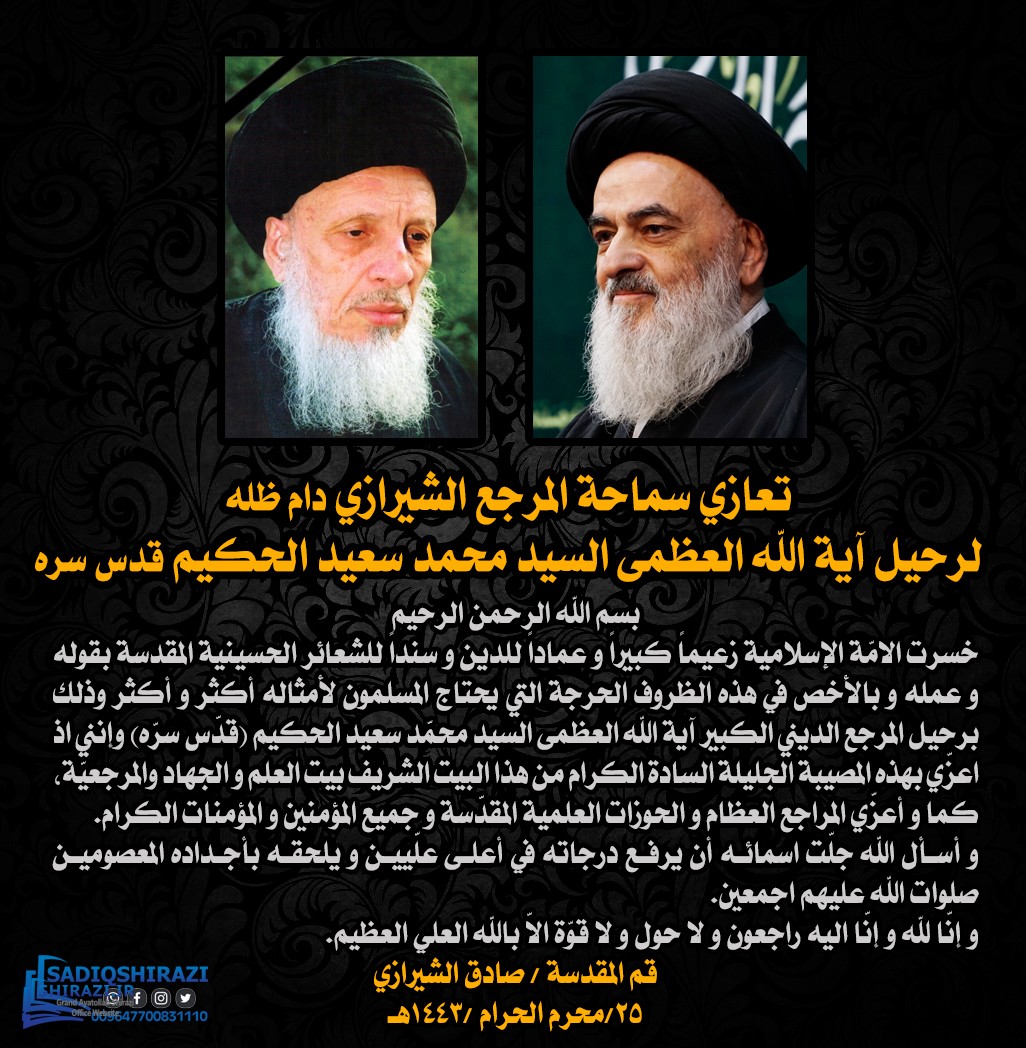 With the passing of Great Ayatollah Sayed Mohammad Saeed Hakim, the Muslim Ummah lost a great leader; he was truly a great supporter of the religion of God, whose words and actions served the sacred rituals of Imam Hussein (peace be upon him) particularly in these critical and difficult situations. I would like to offer my condolences over the passing of this great scholar, to his noble family and the great Islamic authorities, as well as the Islamic seminaries and the general public. I ask of God almighty to grant this great scholar the highest places in the afterlife, and have him reunited with his noble ancestors, the Holy Prophet and the AhlulBayt (peace be upon them). “We are from God and to Him, we shall return, and there is no will and power, above that of the Almighty God.”