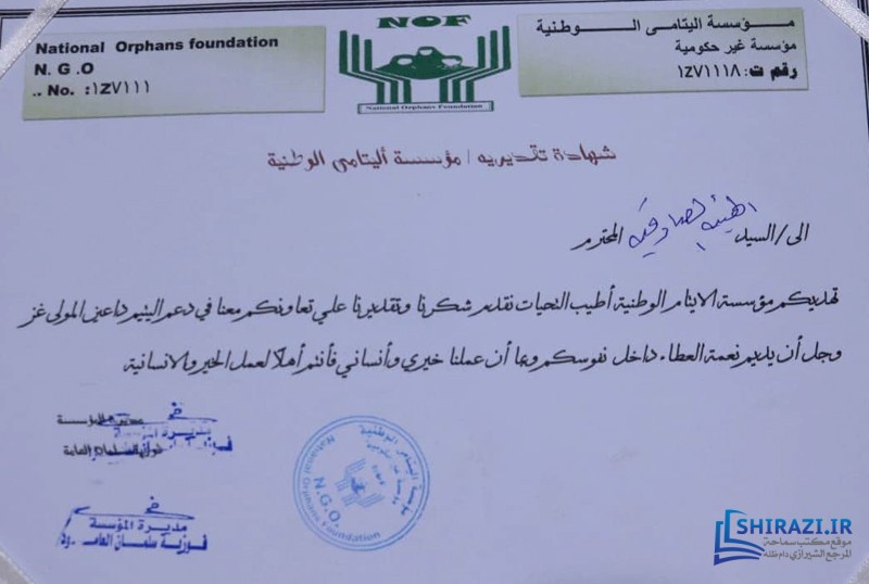 بدوره قدّم مسؤول التوجيه الديني في مؤسسة اليتامى الوطنية، كتاب شكر وتقدير لمسؤول الهيئة الصادقية لتعاونها المستمر ودعمها للأيتام.