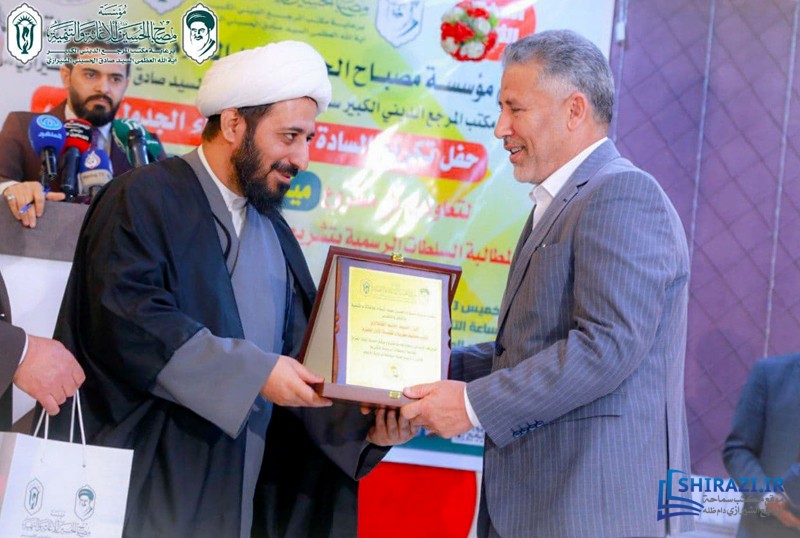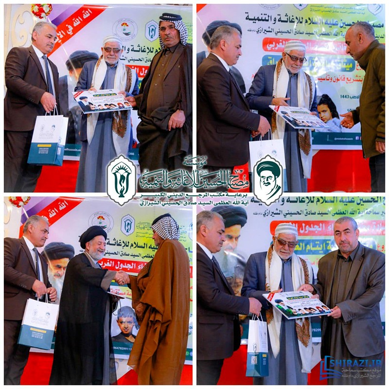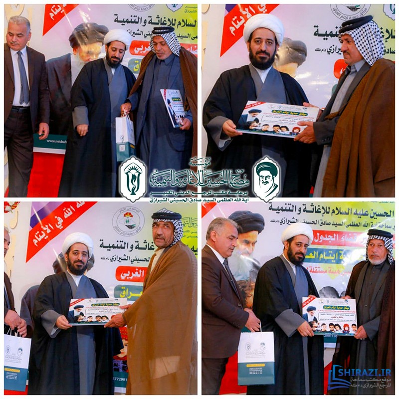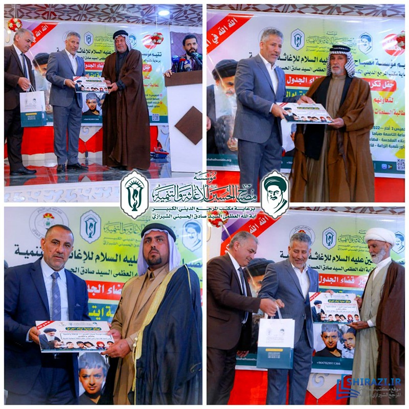 كرّمت مؤسسة مصباح الحسين صلوات الله عليه للإغاثة والتنمية، في مدينة كربلاء المقدّسة، التي تعمل تحت إشراف مكتب المرجع الديني سماحة آية الله العظمى السيّد صادق الحسيني الشيرازي دام ظله، عدداً من مخاتير قضاء الجدول الغربي في محافظة كربلاء، لتعاونهم الكبير في إنجاح خطوات مشروعها الإنساني (ميثاق حماية الأيتام في العراق).