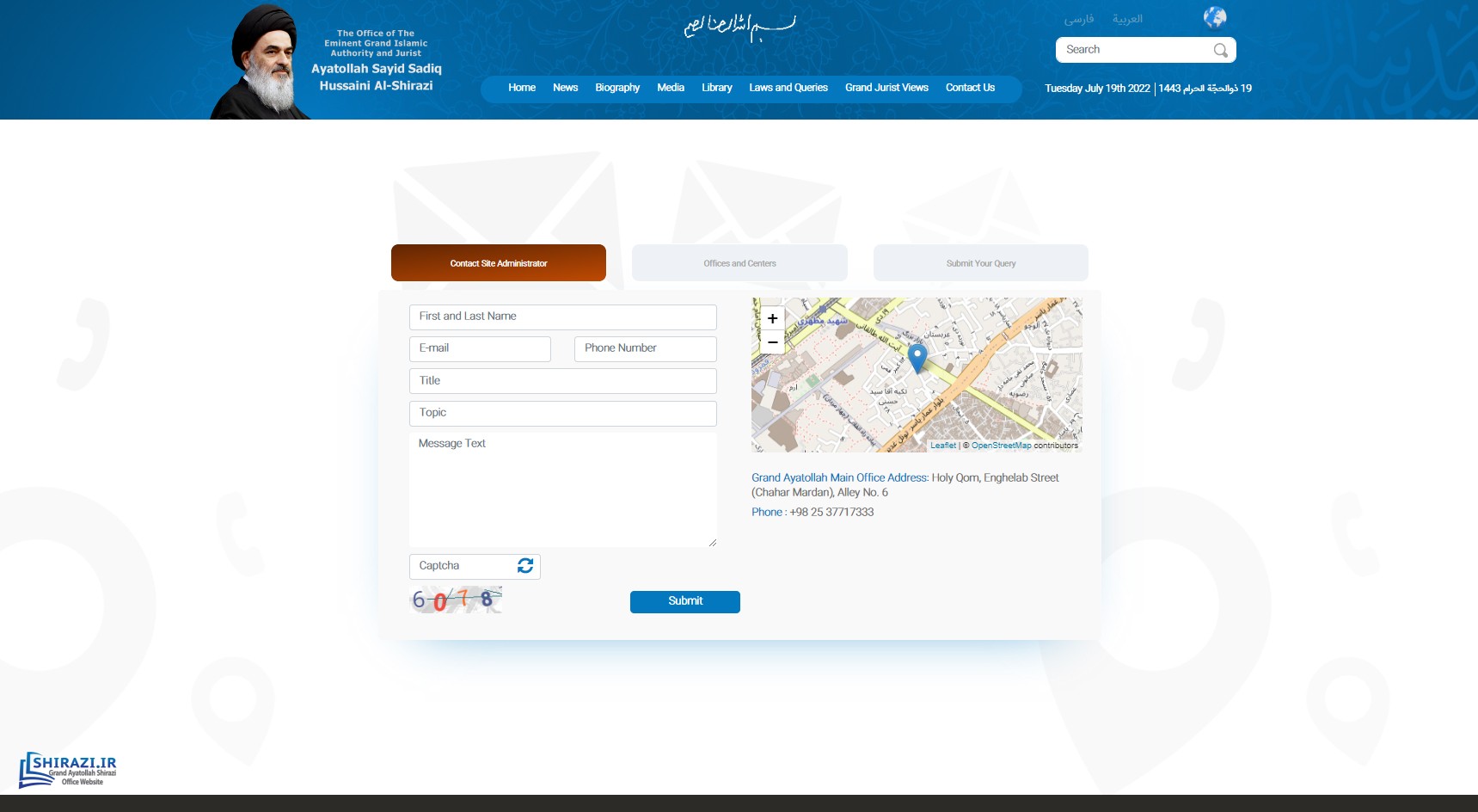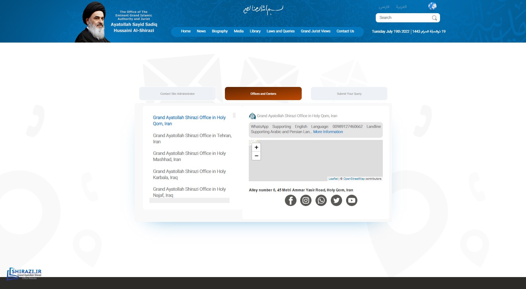 The section for offices and centers includes the introduction of the offices of Grand Ayatollah Shirazi in different parts of the world, seminaries, satellite networks and related institutions, centers, hosseiniyehs and mosques, and for each center, a dedicated page with the address, location, related social media pages and websites as well as communication channels and news archives have been designed.