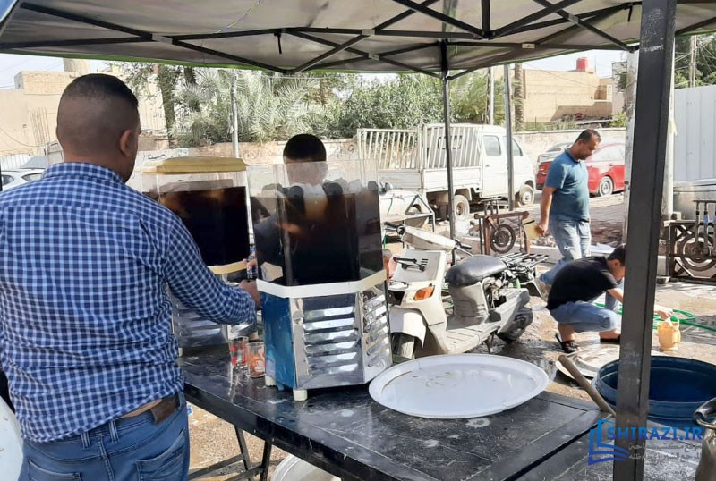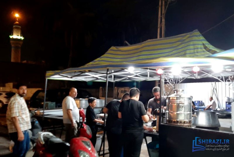 يقوم الموكب بخدمة الزائرين عبر خيمة موكبه في إحدى شوارع المدينة المذكورة على عدّة دفعات يومياً، ومنها توفير أماكن استراحة للزائرين وتقديم الطعام الحاضر وإقامة الصلوات الواجبة جماعة وإقامة مجالس العزاء، وغيرها.