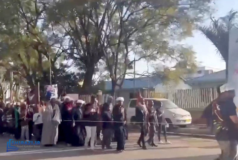 The magnificent procession of the Arbaeen was organized by Sayyid Al-Shuhada Committee in East Africa. This event, in accordance with the recommendations of the esteemed Ayatollah Sayyid Sadeq Hosseini Shirazi, may his shadow endure, aimed at globalizing the rituals of Imam Hussein and reflecting and introducing the grandeur of the Arbaeen to the world. In the procession, hundreds of believers and followers of the Ahl al-Bayt, peace be upon them, from the Shia community in East Africa came together. They not only commemorated the Arbaeen of Imam Hussein but also prayed for the hastening of the reappearance of Imam Al-Mahdi (P.B.U.H). The attendees also supplicated to the Almighty to have their names included among the pilgrims of Imam Hussein, peace be upon him, during the Arbaeen pilgrimage. The Sayyid Al-Shuhada Committee is one of the organizations affiliated with the office of the esteemed Ayatollah Sayyid Sadeq Hosseini Shirazi in Kuwait. They have carried out various charitable, cultural, religious, educational, and welfare activities in underprivileged areas and Shia communities in African countries.