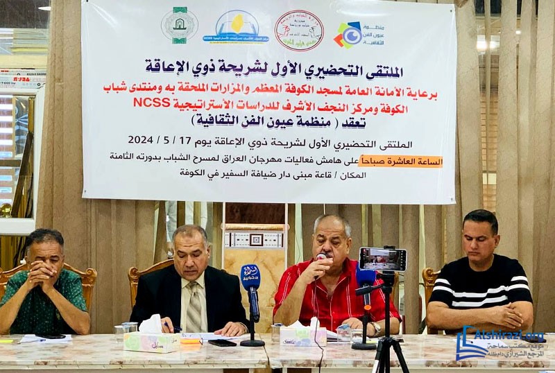 كذلك وبمشاركة إثنى عشر محافظة عراقية، وستة عشر فريقاً، عُقد الملتقى التحضيري الأول لذوي الإعاقة (المكفوفين) برعاية مركز النجف الأشرف للدراسات الاستراتيجية NCSS وبالتعاون مع الأمانة الخاصة لمسجد الكوفة المعظّم ومنتدى شباب الكوفة، الذي عقدته (منظّمة عيون الفنّ الثقافية). وكان الملتقى التحضيري الأول لشريحة ذوي الإعاقة لعقد مهرجانهم الدولي المسرحي، وعلى هامش فعّاليات مهرجان العراق الدولي لمسرح الشباب بدورته الثامنة، الذي سيُعقد في الشهر العاشر من عام 2024 ميلادية.