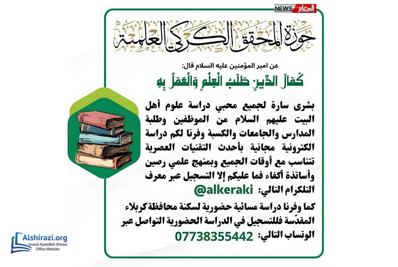 The Allama Mohaghegh Karaki Seminary in Karbala, a center linked to the office of Grand Ayatollah Shirazi, announced the opening of enrollment for its new educational courses, both virtual and in-person. These free courses offer an opportunity for those interested in the teachings of Ahlulbayt to participate in an advanced and flexible learning environment, featuring experienced instructors and modern educational technologies. Additionally, the seminary has introduced a night-time in-person program specifically for the residents of Karbala.