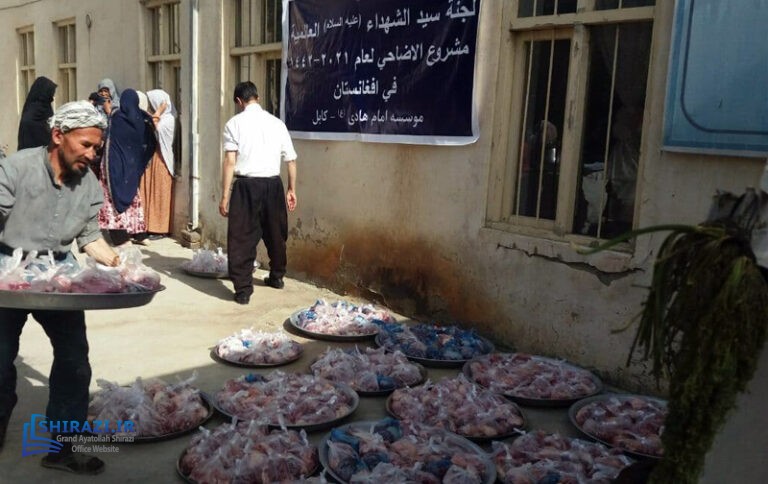 Each year on the Eid Aladha, some sheep are sacrificed and their meat is donated to needy families. Needy families in the cities of Kabul, Bamyan, Ghazni, Qandahar, Badakhshan, Daikundi and several other provinces received these donations. Sayed Shuhada Committee in Kuwait and Imam Hadi Institute also collaborated with the Grand Jurist’s Office in this charity work.