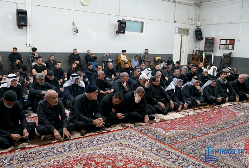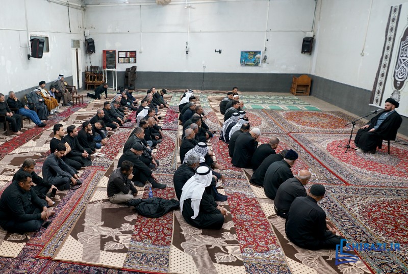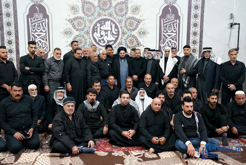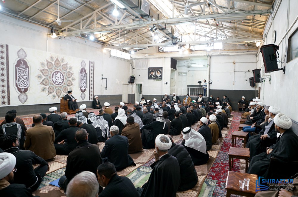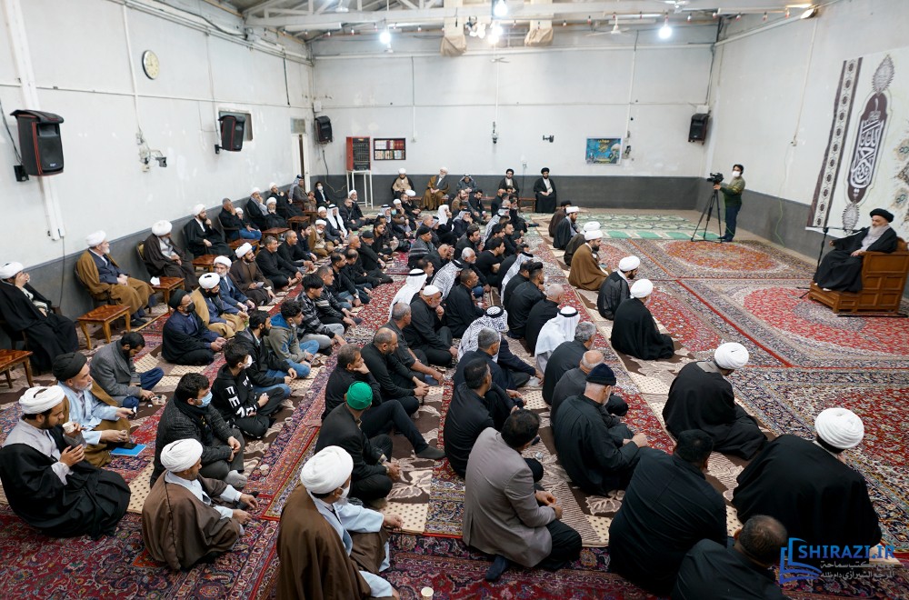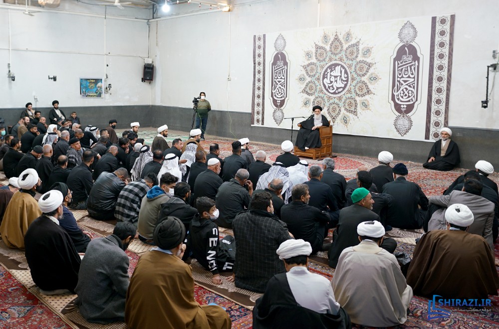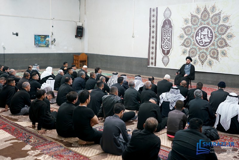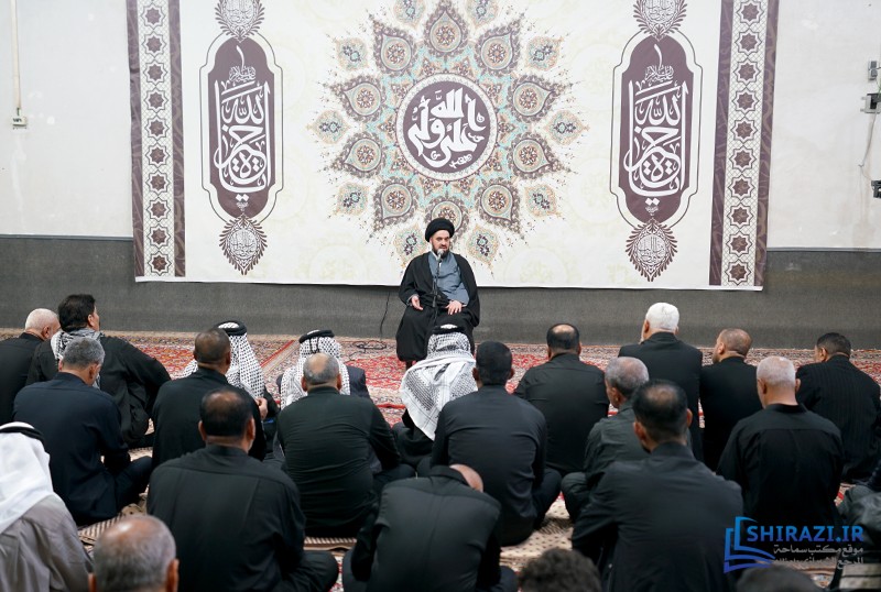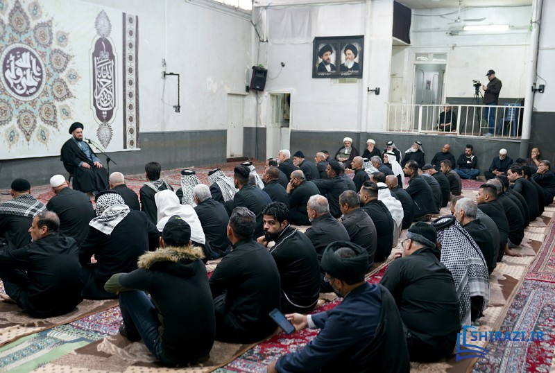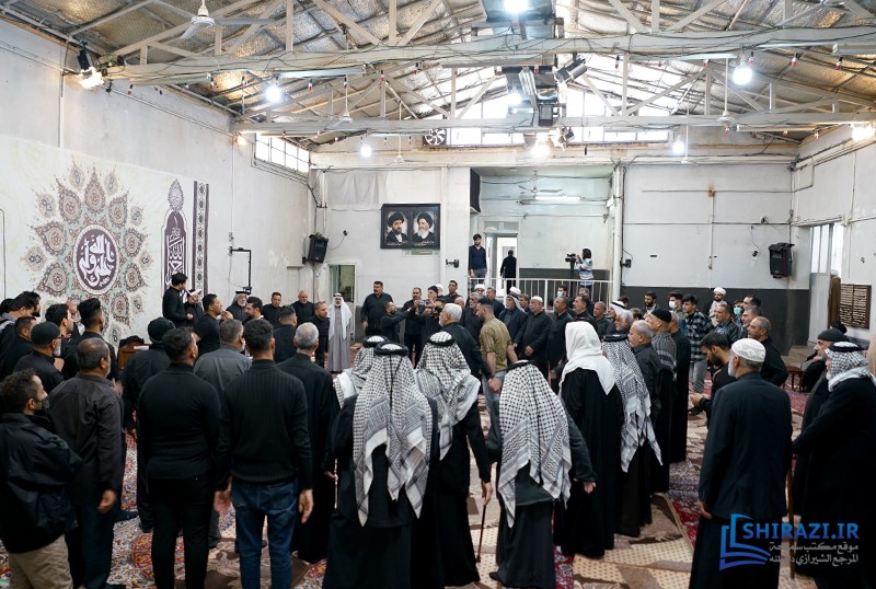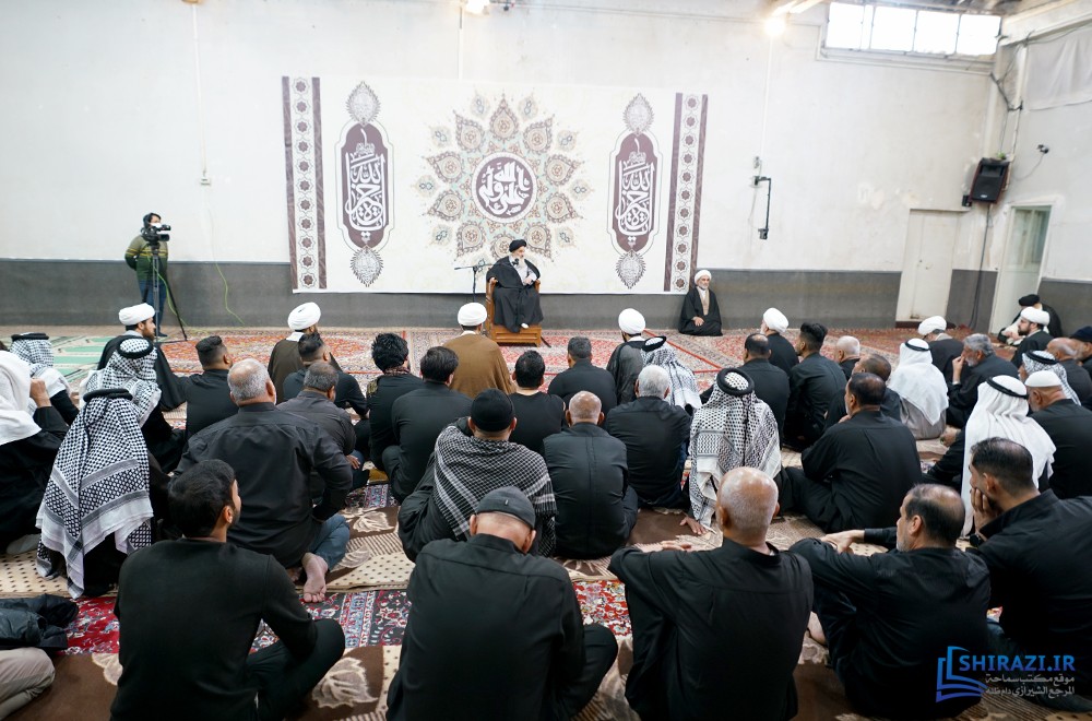 خلال حضورهم في بيت المرجعية، شارك أعضاء القافلة والموكب المذكورين بالجلسة العلمية اليومية المنعقدة في بيت سماحة المرجع الشيرازي دام ظله، وأقاموا العزاء على مصاب أهل البيت الأطهار صلوات الله عليهم وشاركوا في أداء صلاتي الظهر والعصر جماعة، وبعدها استمعوا إلى كلمة نجل سماحة المرجع الشيرازي دام ظله، حجّة الإسلام والمسلمين السيّد جعفر الشيرازي.
