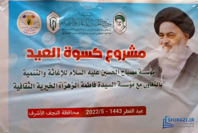 كما قام الممثّل الآخر عن مكتب المرجعية في مدينة النجف الأشرف، حجّة الإسلام الشيخ صلاح الحلفي، بإهداء ألبسة العيد كعيدية للعديد من الأطفال الأيتام وأطفال المتعفّفين بالمدينة المذكورة، وذلك بمناسبة حلول عيد الفطر المبارك 1443 للهجرة. وتم الإهداء بالتعاون مع مؤسسة مصباح الحسين صلوات الله عليه للإغاثة والتنمية في مدينة كربلاء المقدّسة.