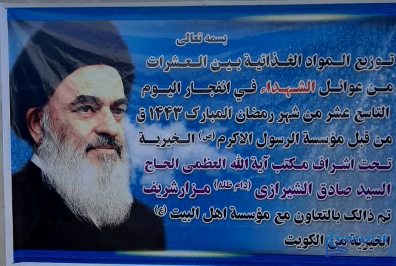 جرى ذلك بالتعاون مع مؤسسة اهل البيت صلوات الله عليهم الخيرية في دولة الكويت، وجاء انطلاقا من وصايا سماحة المرجع الشيرازي دام ظله الداعية الى ضرورة الاهتمام بعوائل الشهداء الكرام، ووزّعت العشرات من المساعدات المذكورة، على عوائل الشهداء وكذلك عوائل المصابين في الانفجار الارهابي المذكور.
