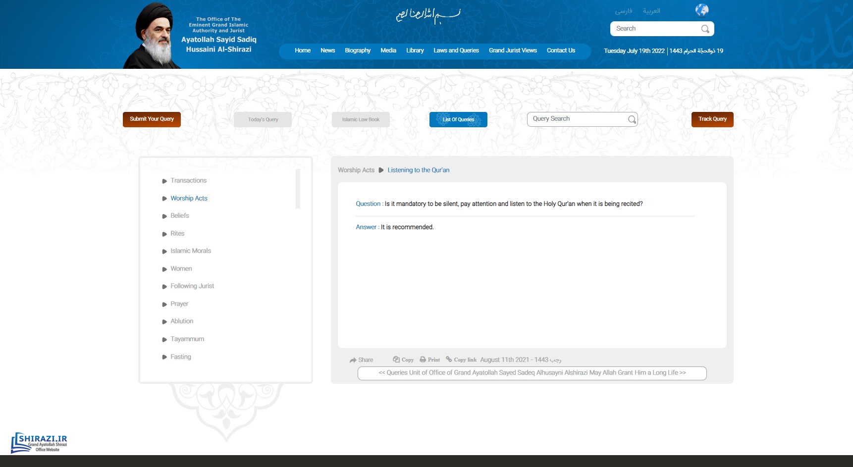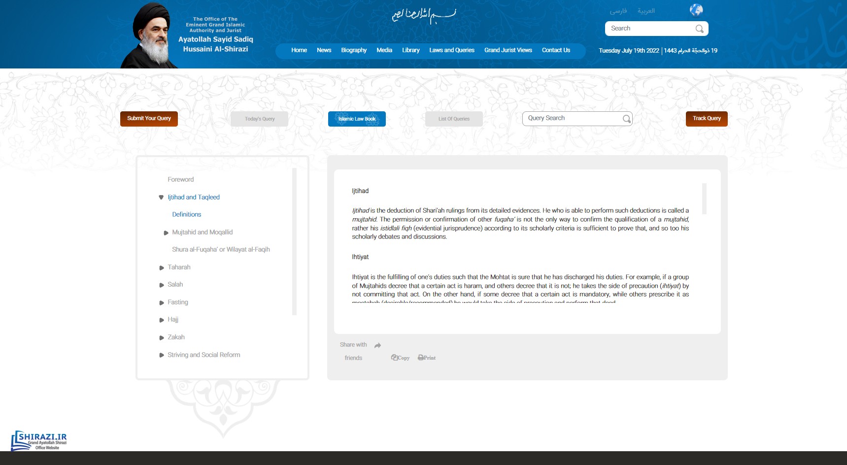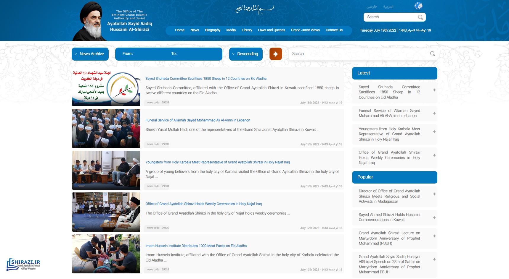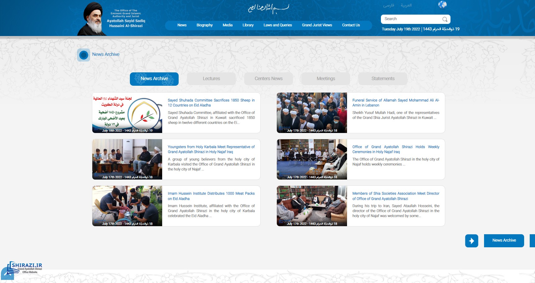 On the glorious Eid al-Ghadir, the official website of the Grand Shia Jurist Ayatollah Sayed Sadiq Shirazi was launched into a new format. This website is now accessible on www.shirazi.ir, in the three languages of Persian, Arabic, and English. The new services on this website are: