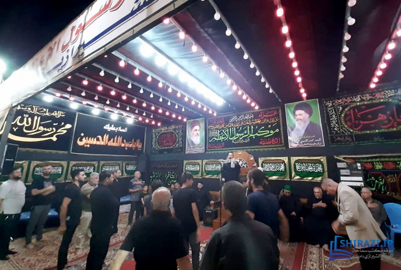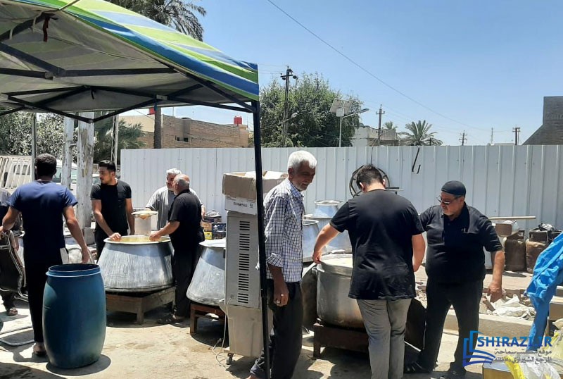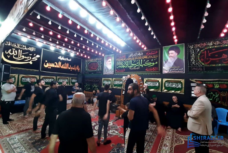 يقوم الموكب بخدمة الزائرين عبر خيمة موكبه في إحدى شوارع المدينة المذكورة على عدّة دفعات يومياً، ومنها توفير أماكن استراحة للزائرين وتقديم الطعام الحاضر وإقامة الصلوات الواجبة جماعة وإقامة مجالس العزاء، وغيرها.